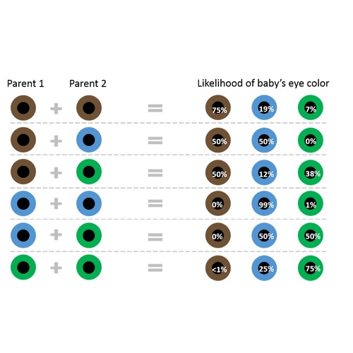Ik heb zelf kastanjebruine ogen en m'n man heeft knalblauwe ogen. Als ik naar het schemaatje hieronder kijk is de kans gewoon 50/50 bruin/blauw voor ons dochtertje. Nu heb ik van mijn moeders kant(haar vader dus mijn opa , en ook 2 broers en 1 zus) wel familie met blauwe ogen. Of dat nog effect heeft geen idee. Ik vermoed toch dat ze bruine ogen zal hebben 😊 Ben benieuwd!