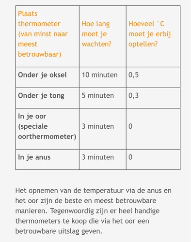 2) rectaal thermometer nooit gebruiken onder de tong of oksel of wat ook en dan x erbij optellen: is niet betrouwbaar, nooit doen;
