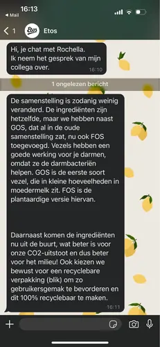 Wij gebruiken hier Etos nummer 1 voor onze tweeling en inderdaad naar een tijd niet leverbaar nu de vernieuwde potten. Het poeder is nu veel fijner, witter van kleur en lijkt minder vet. De grammen van het schepje zijn aangepast. En helaas doen ze het beide minder goed op deze voeding. Beide sinds een week op de vernieuwe voeding minder tevreden tussen de flessen, krampjes, scheetjes en waterdunne ontlasting…