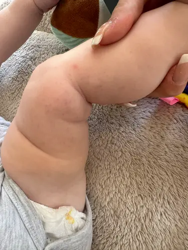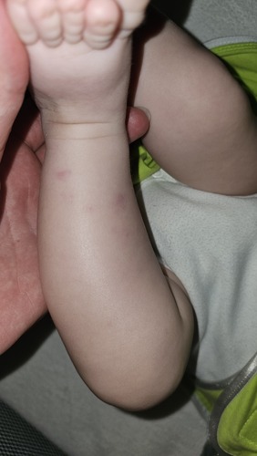 Voor mij zien de plekjes op de foto's eruit als muggenbulten. Die zwellen op de babyhuid meestal niet zo op, maar zijn kleine ronde plekjes die met een paar dagen weer wegtrekken. Zou dat het niet kunnen zijn?
