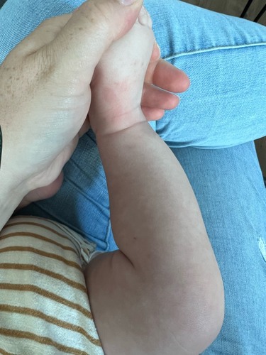 Bedoel je dat beetje gemarmerde in zn huid? Is dat niet omdat de doorbloeding van jonge kindjes nog in ontwikkeling is?