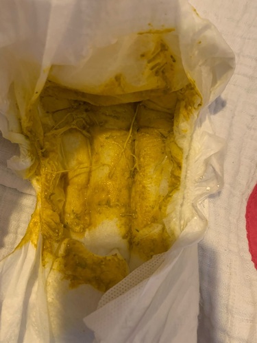 Wij hadden ook zoiets, maar dan dunnere slijmdraden. Toen ook de huisarts een fotogeappt, die zei dat het normaal was en van de darmwand kwam.