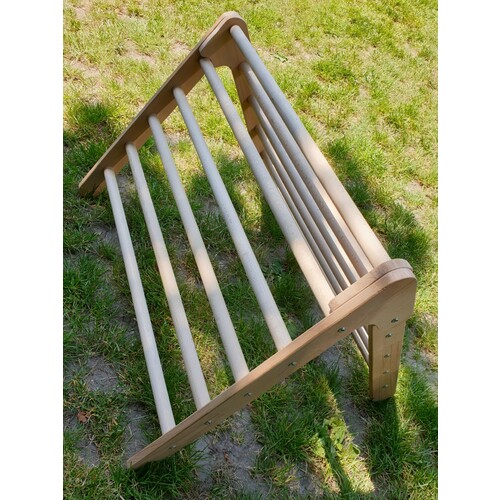 Op Etsy verkoopt hij de bouwtekeningen. Bij de bouwtekeningen zit oa een versie op A3-formaat. Als je die uitprint krijg je losse vellen die je aan elkaar kunt plakken en dan kunt uitknippen en omtrekken op het hout. Heb zelf wel elke poot langer gemaakt, zodat hij wat hoger wordt en er aan beide kanten 2 staven extra tussen passen (dit kun je doen door voor elke poot een extra vel van de A3-bouwtekening ertussen te plakken).