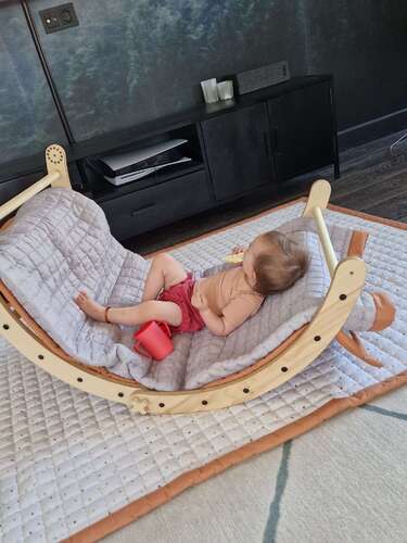 Wij hebben een pikler met glijbaan, op zich leuk ding voor haar. Mij geeft het vaak een hartaanval van de kuren die ze allemaal doet op dat ding.