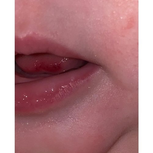 Heeft ze pijn bij het eten? Ik zou contact opnemen met de huisarts want is wel heel erg rood.🥺