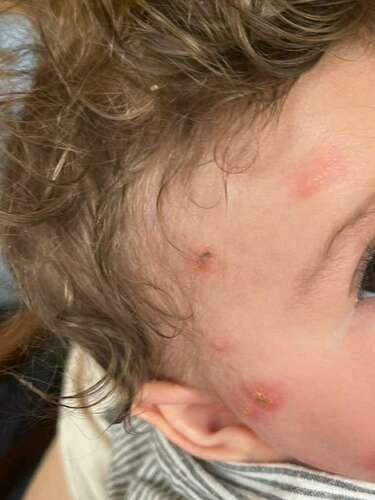 Ik denk ook eerst aan muggenbulten. M'n dochter had van de week ook vocht er uit, dat kan ook bij muggenbulten. Ik reageer zelf ook wat heftiger dan gemiddeld een vind het erg herkenbaar. Zit het vocht/ korstje grotendeels precies in het midden? Lijkt op de foto's wel zo.