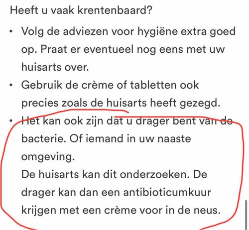 Dit lijkt erg op de krentenbaard die mijn dochter ook steeds heeft. Bij haar is het ook al 3 keer teruggekomen en is heel hardnekkig met wegkrijgen. 😩 Eerste keer ook na weken smeren een antibioticakuur gekregen. Toen was het weg. Daarna kwam het terug op de kin en gezicht, weer weken smeren. Leek weg te zijn, maar kwam terug; eerst op de ene arm, en vervolgens de andere arm. Wat een ellende hè?