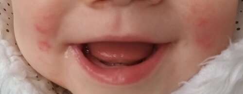 Hij kwijlt erg veel en heeft veel snot. Zn neusje ligt ook wat open onderaan door het snot. De rode plekjes zijn vnl rond zijn lippen, minder op de kaken. Daarnaast is hij erg aanhankelijk, wou afgelopen nacht echt niet naar bed, en weent vaak.