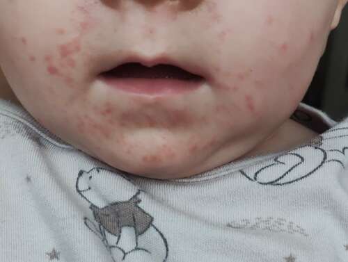 Bij ons kwam dat door het kwijlen. Uitslag inderdaad. Door zijn gezichtje goed droog te houden en in te smeren met vaseline werd het beter!