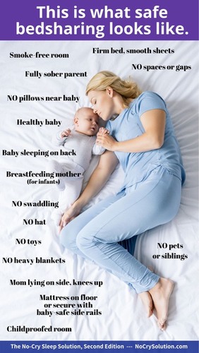 Ik heb net het boek van James McKenna over veilig samen slapen uit, en hij zegt dat samen slapen net zo veilig kan als in een eigen bedje, maar wel met een behoorlijk setje basisregels. Dit plaatje vat het behoorlijk samen, hoop dat dit wat verlichting brengt!!