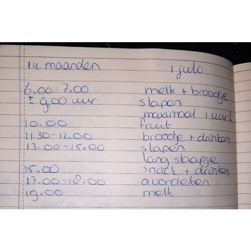 Onze zoon van 14 maanden slaapt sochtends tussen 9 en 10 een half uurtje/45 minuten en smiddags tussen 13.00 en 14.30 een uur/ander half uur. Savonds rond kwart voor 7 slapen en de volgende ochtend rond 7u weer wakker.