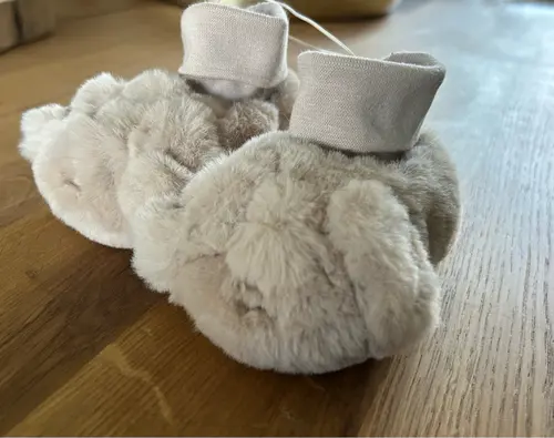 Mijn zoontje is 2.5 jaar en had konijnen slofjes gekregen, niet deze maar vergelijkbaar. Ik vind ze, zelfs nu nog, zeer onhandig en worden nu gebruikt als knuffel om mee te spelen. Zeker bij een newborn lijkt het mij veel te lomp. Mijn zoontje was bij de geboorte wel heel klein (maat 44) en paste sokjes niet eens fatsoenlijk, dat werden dan kniekousen馃槀 ik was wel blij met sokken die uberhaupt bleven zitten馃き