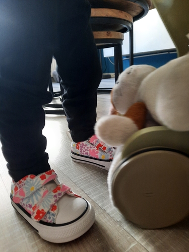 Ik heb Converse sneakers liggen maar die zijn stugger dan Nike. Beide merken zijn wel flexibeler dan een echte kinderschoen maar stugger dan de leren lopen schoenen van shoesme.