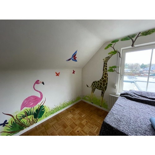 - ik heb bewust voor een vlak gekozen, zodat ik niet de hele muur hoefde te doen. Er zitten veel 'oneffenheden' in de muur dus wij zijn we er toch wel een keer op 6 overheen gegaan met flexa verf om alles goed te dekken.