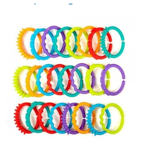 Ik deed bijtringen aan elkaar vast van de ene kant naar de andere kant van de eetstoel en maakte daar nog extra speelgoed aan vast. Ideaal, uren speel plezier en ik kon mijn ding doen. Zo heb ik ze ook in de auto opgehangen, haakje gemaakt aan de plafond en deze vast gemaakt dat vloog ook alle kanten op en aan de kinderwagen van de ene naar de andere kant