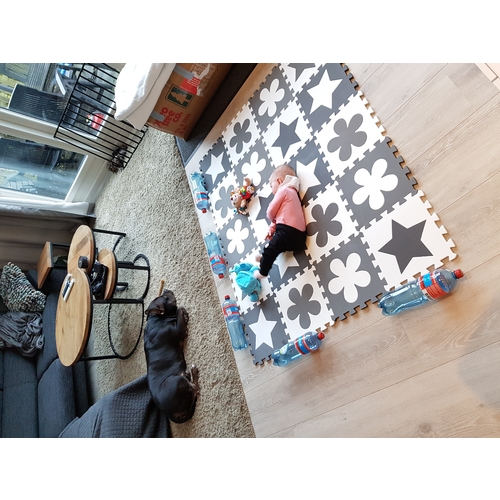 Foammat van happykiddoos.nl... lekker zacht, niet koud... en je legt er gewoon wat speelgoed op... enne het ziet er nog leuk uit ook. Je kan er trouwens ook een huisje van bouwen... en de sterretjes en bloemetjes kunne er ook uit. En makkelijk schoon te houden 🤓 ook handig voor buiten van de zomer 🙂