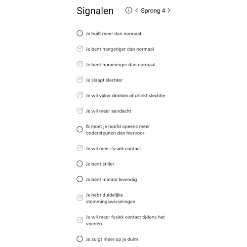 Ik ben wel benieuwd hoe jullie weten dat je kindje in een sprong zit. Mijn kindje is namelijk bijna 15 weken en wil opeens heel vaak drinken s nachts. Ze is al een paar keer van rug naar buik gerold, maar verder merk ik eigenlijk niks. Het is ook nog wat vroeg voor sprong 4, vandaar de twijfel. Maar die nachten zijn wel echt super zwaar en totaal niet wat ik ben gewend. Eerder kon ze 5,5 uur zonder voeding, nu meestal maar 3 en soms wil ze zelfs nog vaker. Maar verder is ze vrolijk en slaapt goed in.