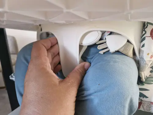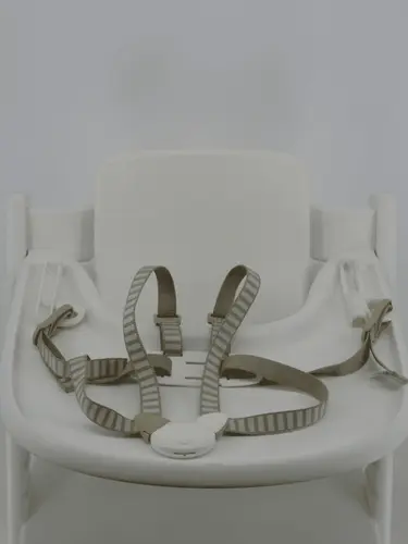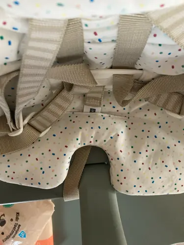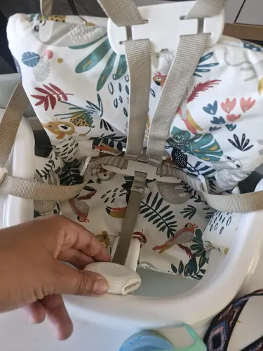 Volgens mij zit hij bij ons ook zo. Ik zorg altijd dat het ding waar je de gespen in klikt over de rand hangt en dan zet ik haar in de stoel. Dan kan ik hem gewoon van bovenaf dicht klikken, want dan kan ik gewoon het riempje omhoog halen.