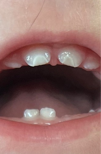 Off-topic: ik zou ook het lipbandje even laten checken. Dat bultje onder de kaak kan te maken hebben met een korte lipband, waardoor de mond tijdens het slapen niet helemaal sluit. Dat is niet goed voor het gebit (juist ook het volwassen gebit).