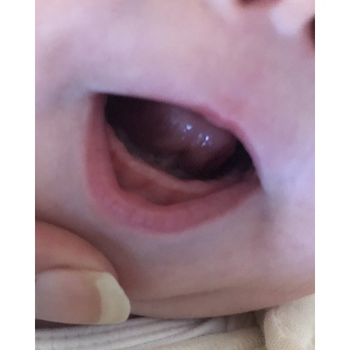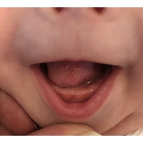 Ik zie niet veel om eerlijk te zijn. Als tandjes doorkomen komen er echt gaatjes in het tandvlees. Dat heeft je dochter zo te zien niet. Met de leeftijd van 3 maanden stoppen ze alles in hun mond om te ontdekken. Een beetje kwijlen hoort hierbij.