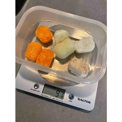 Ik heb in de vriezer de ingrediënten gepureerd en in ijsblokbakjes gedaan, daarna in zakjes. Ik heb zoete aardappel, gewone aardappel, rijst en pasta en iets daarvan combineer ik dan vaak met 2, soms 3 soorten groente en dan een klein deel gebakken kip of kabeljauw, ook allemaal gepureerd en in ijsblokbakjes gedaan. Zo kun je heel makkelijk elke keer verschillende combinaties maken.