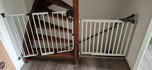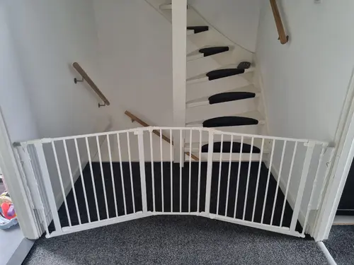 Wij hebben precies dezelfde trap als jullie. Door dat ronde stuk aan de onderkant, kun je niet 1 hek met 2 deuren want je kan hem niet vastmaken in het midden (steekt niet zover uit als het ronde deel onderaan). Wij hebben het als volgt gedaan: Naar beneden een gewoon traphekje. Naar boven traphekje Fenns saftydoor A3. Deze kan schuin en heeft bevestigingspunten. En dan tussen de 1e trede en de vloer een plank zodat deze niet meer open is.