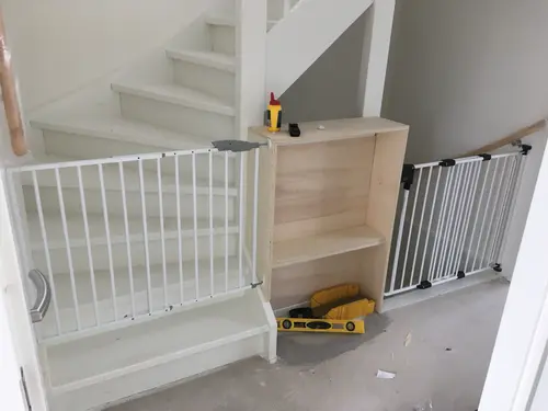 Wij hebben dit ook en we hebben het traphekje op de 2e trede geplaatst zegmaar. En dan tussen de muur en de balk
