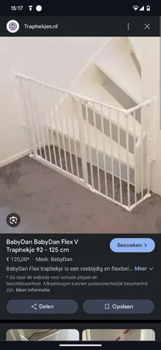 Ik weet niet precies hoe je situatie is maar wij hebben 2 trappen boven elkaar. En we hebben een soortgelijk traphek als op de foto van 180 cm met 2 deurtjes en dan hebben we hem ongeveer 1 meter vanaf de trappen geplaatst. Van de ene muur naar de andere muur. We gebruiken enkel het deurtje bij de trap naar boven, als je struikelt, struikel je niet naar beneden. Maar goed, daar moet je wel ruimte voor hebben. Volgens mij is ie ook van babydan, 180 cm ofzo?
