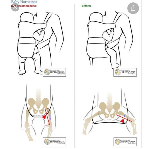 Wel even op letten dat je je kindje niet met de benen naar voor draagt, dat is niet goed voor zijn heupjes.