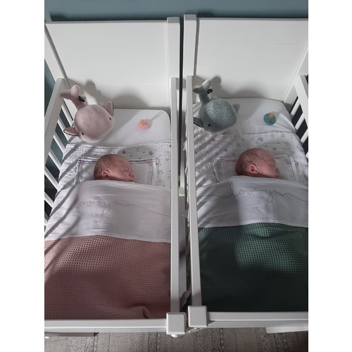Wij hebben 2 wiegjes naast elkaar staan. Dit zijn ze zo gewend vanaf de couveuse afdeling. Zo horen ze elkaar wel, maar kan je ze wel strak instoppen en veilig in het wiegje leggen. Ze slapen goed over het algemeen. 馃グ