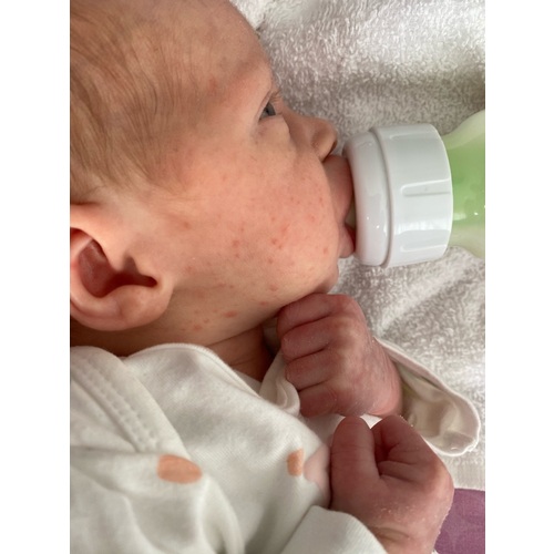 Ons dochtertje had ook een allergische reactie, een verdenking van koemelkallergie maar zij had hele andere symptomen.