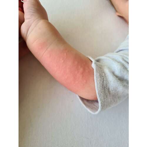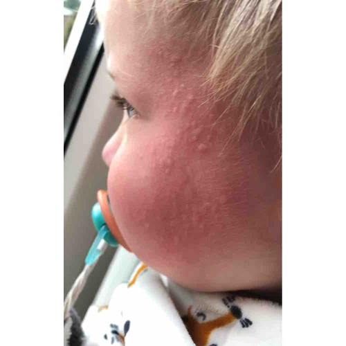 Hij heeft desloratadine drankje gekregen en was vrijwel direct daarna jeuk/pijn vrij en vanmorgen was alle uitslag weg.