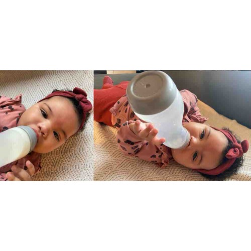 Ze wilde al fles vasthouden bij net 4 maanden,duwde zelfs vaker onze handen weg en wilde ze m alleen vasthouden, maar dat ging natuurlijk nog niet, dus pakken we m meestal bij de achterkant vast en zij vooraan met 1 of beide handjes. Vandaag had ik even t flesje tussendoor eruit gehaald voor t tussendoor boertje en ff rust (anders spuugt ze), pakte ze me bij mn mouw en trok ze zo de fles weer naar dr mond 🤣 geweldig hh. Volgende week maandag is ze 5 mnd.
