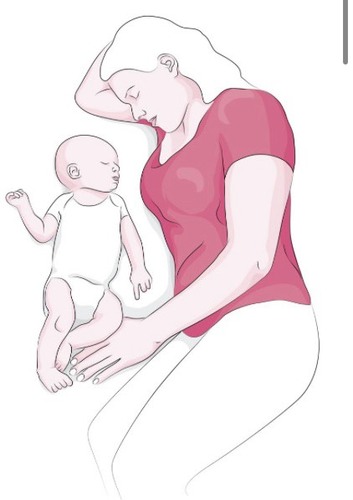 Misschien moet je haar wat lager leggen? Het is even zoeken naar hoe je op deze manier comfortabel slaapt…maar als je je draai gevonden hebt kan het wel! Ik zou persoonlijk bij een kindje van 4 maanden nog proberen zo veel mogelijk in deze houding te slapen. Vanaf een maand of 9 is het ergste risico op wiegendood wel weg en dan kun je wat meer experimenteren met gewoon tussen jullie in liggen of andere houdingen. Maar kijk ook naar je kind, hoe alert is het, hoe diept slaapt hij etc.