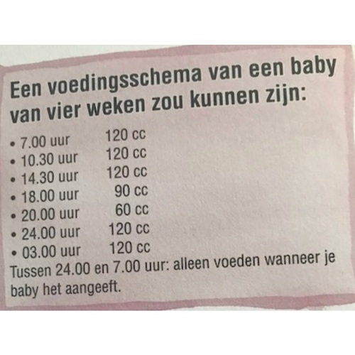 Maar ik denk wel dat de cijfers in bovenstaand voedingsschema enkel het water is. In elk geval vind ik het lastig dat ze spreken gewoon over een baby van 4 weken. Die kan zowel 4 als tot 6-7kg wegen 🤷🏻♀️