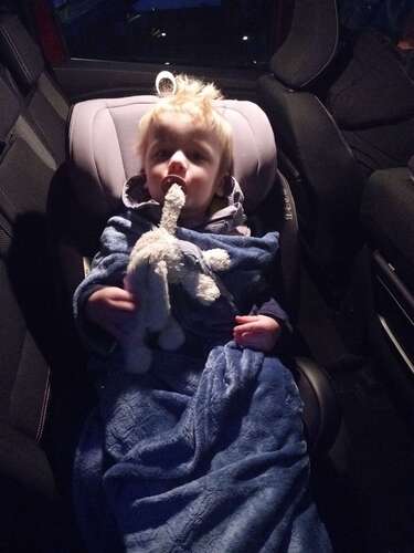 Er bestaat een reisponcho voor in de auto! Wij hebben er ook een was €30 euro geloof ik!