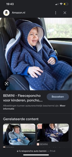 dit merk is het van Bemini. Echt ideaaaal voor de koude dagen en veel veiliger dan dikke kleding of een jas in de auto! De gordels gaan onder de poncho gewoon zoals ze normaal moeten zitten en de poncho komt eroverheen
