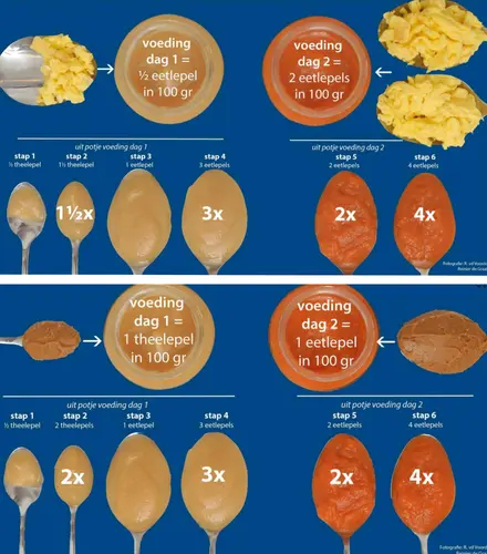 Wij hebben het schema van mama roos gevolgd. Ik heb het even voor je terug gezocht, maar wij begonnen pas op dag 30 met pindakaas. Dat was 1/4 theelepel pindakaas door 2 ijsblokjes gepureerde sperziebonen. Dit herhaalt op dag 37, 44, 53 en 60. Dus heel langzaam opgebouwd. Later hebben we het langzaam qua hoeveelheid opgebouwd. Echt dus niet zo veel en snel als het cb zegt. Ei ongeveer hetzelfde en dan qua hoeveelheid 1/8 ei.