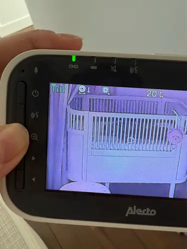 Ik heb de babyfoon nu aan de overkant gezet op een boekenplankje. Echter, zie ik haar niet heel goed omdat ik haar van de zijkant door te spijlen van het bedje heen zie..