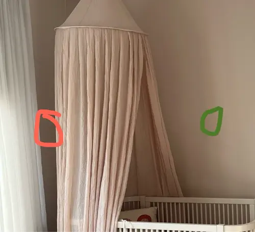 Nog iets om over na te denken: stel je hangt hem bij cirkel groen, houd dan ook rekening met de kabels van de babyfoon. Die grijpgrage handjes kunnen er dan misschien ook makkelijk bij, omdat het bij de zijkant van haar bed is.