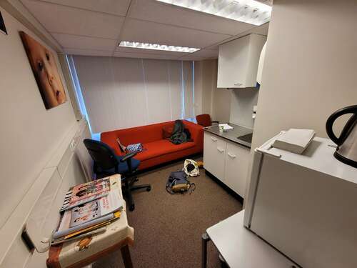 En hij is ook echt top ingericht hier! Bank, koelkastje, aanrecht, tafel met mamabladen en foto van een baby aan de muur.