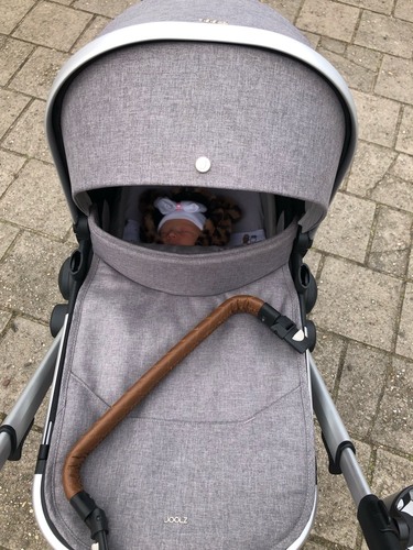 Hij lag in de kinderwagen, en had een vestje aan over zijn kleertjes, mutsje op en een dekentje over zich heen.