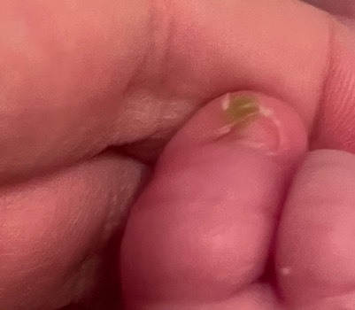 Lijkt idd op een ingegroeide nagel. Mijn zoontje heeft dat ook veel gehad. En nu is hij 2 en zijn nagel scheurt ook altijd vanaf die lengte.