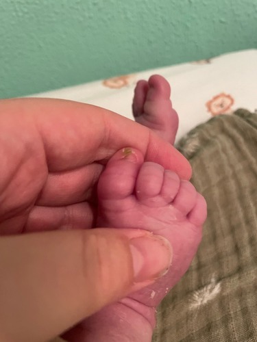 Advies is om dit morgen te laten beoordelen bij de huisarts. Echt niet mee wachten. Als het een ingegroeide teennagel is met ontsteking (waar dit sterk op lijkt) kan het snel groter en dus vervelender worden. Hoeft absoluut niet maar ik zou geen onnodig risico lopen bij zulke kleintjes. Wat goed dat je dit hebt ontdekt en zo alert bent :).