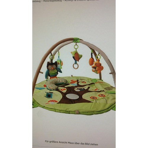 Wat ik niet snap van die houten bogen, is dat die alleen dingen in rugligging stimuleren. Het kleed dat wij hebben heeft ook dingetjes voor buikligging, zoals knisperdoekjes, labeltjes, een soort toetertje, verschillende structuren stof.