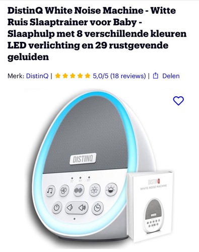 Super blij mee. Via een app op je telefoon kun je het geluid, volume en licht in verschillende kleuren instellen. Ik gebruik hem ook als nachtlampje. Je hebt veel keuze aan geluiden, ik wissel wel af, maar zeegeluid werkt hier als favoriet. Er zitten natuurgeluiden, dierengeluiden en white noise geluiden op.