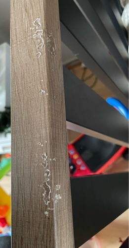 Bij ons precies hetzelfde. Hebben een zwarte box en zoontje z鈥檔 hele gezicht zat onder de zwarte schilfers馃槀 Ik denk juist dat het zo is dat het kindvriendelijk verf is, zoals tegenwoordig bv ook geen verf op terpentine basis gebruikt mag worden in huis. Maar met vocht (speeksel of water) laat die verf gewoon los. Heb het nl ook als ik de box afneem met een vochtige doek. Wrijf de verf er dan zo vanaf. Ook met het tafelblad van z鈥檔 kinderstoel (kidsmill) hetzelfde probleem.