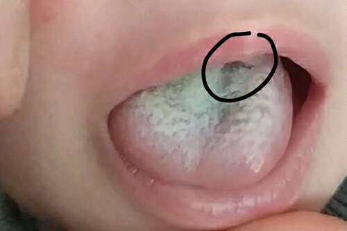 De kleur was wel donkerder bij mijn zoontje zonder wit erom heen. En dit is wel een dikke laag op de foto.. wij maakten het meerdere malen na zn flesje zijn tong steeds schoon. Dat hielp ook wel