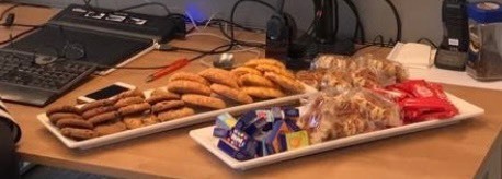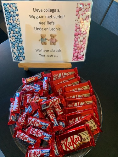 Met 120 collega's is dit natuurlijk niet te doen. Toen ik na de geboorte meer mensen wilde trakteren heb ik geboortekoekjes besteld. Die zitten individueel verpakt dus was ideaal toen tijdens corona tijd en blijven ook wat langer vers zo.