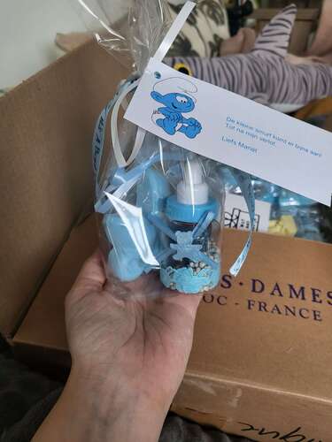 Ik heb een grote doos met geboorte stoepkrijt besteld. Dan heb ik gelijk voor mijn collega's en voor de crèche van mijn zoontje. Nog een leuk gevuld flesje erbij met een smurf erin en een briefje :)